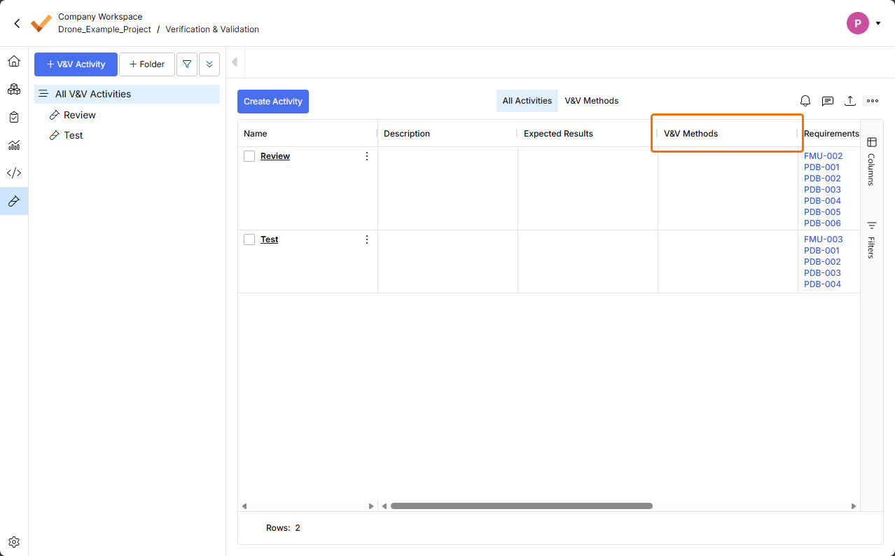 The V&V Methods column in the list of activities in the Verification & Validation module