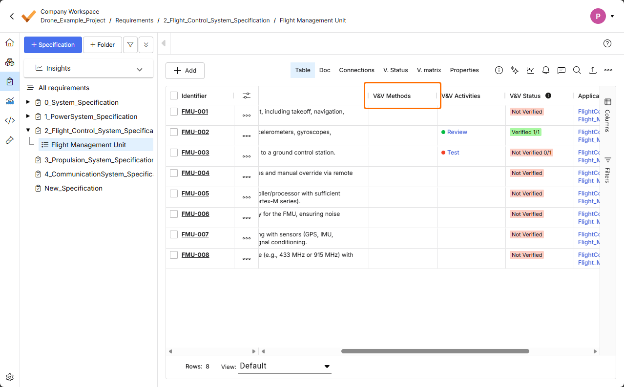 In the example shown below, several requirements were selected, and some of them have V&V activities assigned.