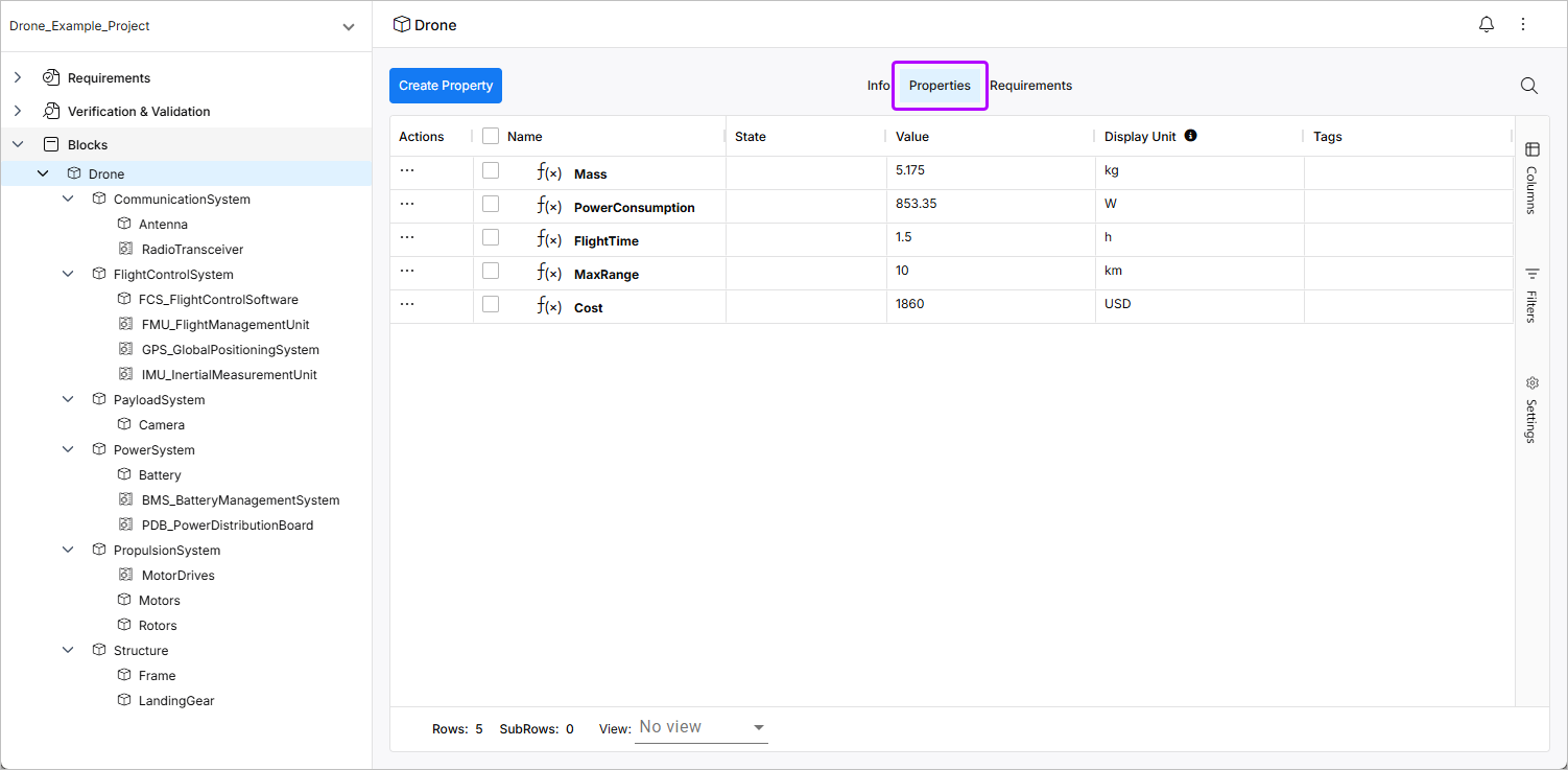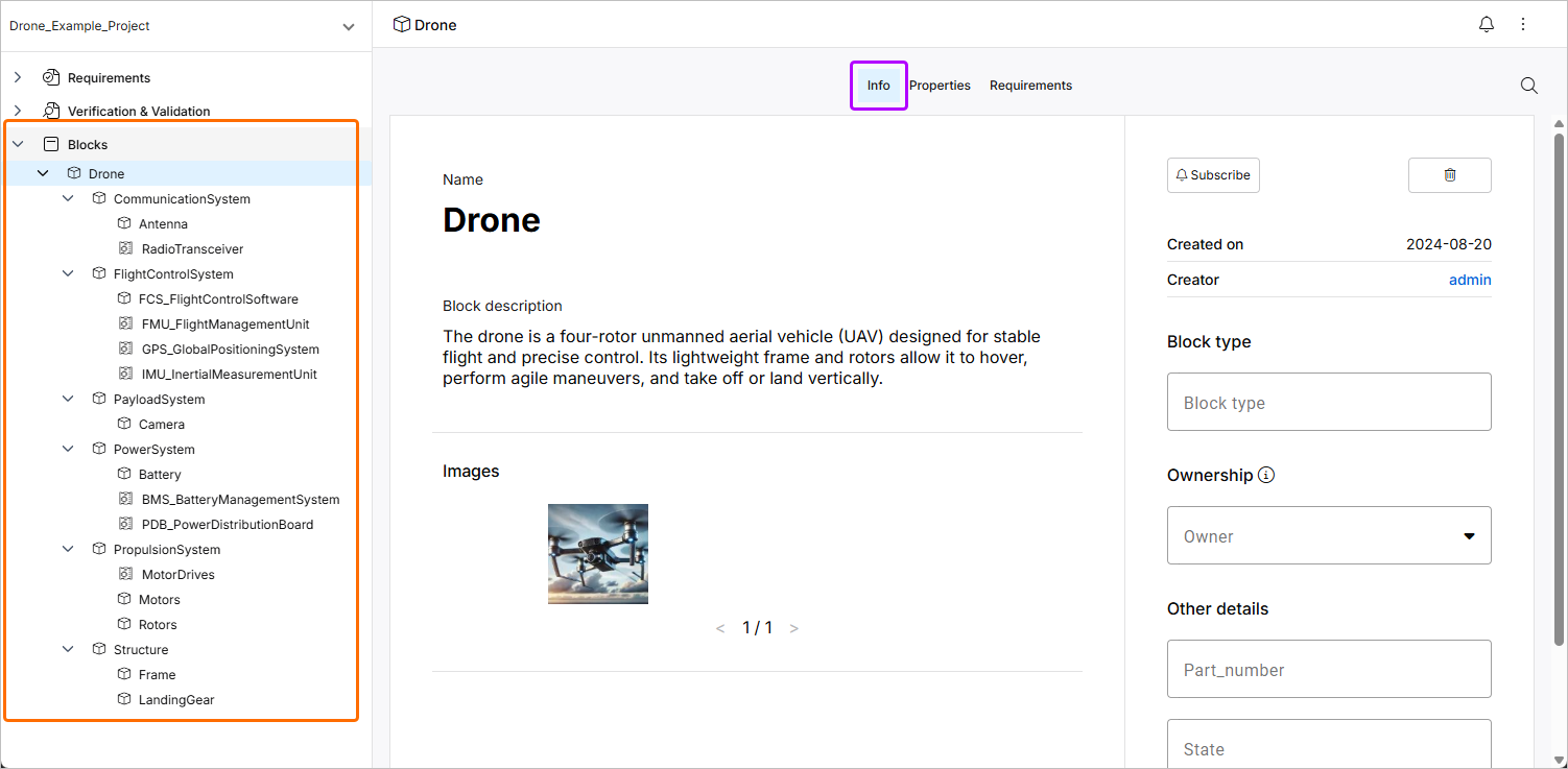 Блоки - это элементы конечного продукта (это может быть физическая часть, например структура, или логическая часть, например орбита, операции и т. д.), которые представлены иерархическими отношениями в дереве блоков. Верхний блок - это, как правило, ваш продукт, например, автомобиль, спутник или любая другая система. Далее он может быть разбит на субблоки, представляющие несколько физических, функциональных и логических составляющих системы.