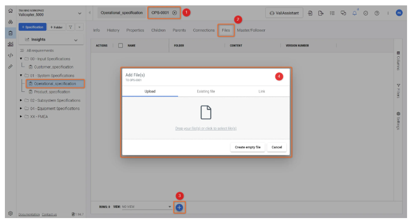 Самый простой способ добавления изображений в требования - щелкнуть идентификатор требования в таблице требований, что приведет вас в раздел подробностей требования (1). На этой вкладке нажмите на раздел "Файлы" (2), а затем на значок "+" (3)откроется всплывающее окно, в котором вы можете добавить изображения или документы путем перетаскивания (4). К одному требованию можно добавить несколько изображений или файлов.