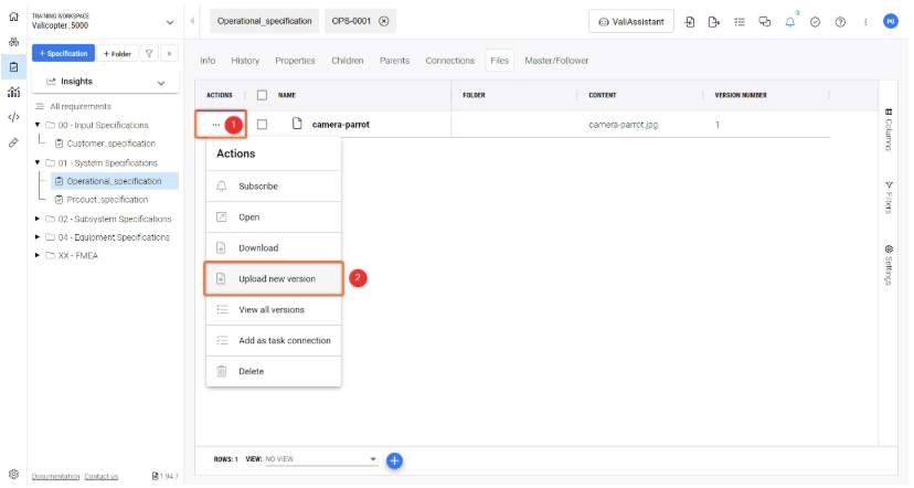 Портал требований позволяет пользователям добавлять различные версии файлов в одно Требование. Для этого вы можете выбрать три точки на файле/изображении (1) и нажать на кнопку "Загрузить новую версию" (2) чтобы загрузить обновленную версию:
