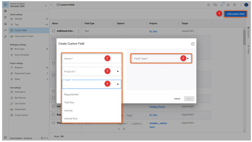 Портал "Требования и системы" предлагает широкий выбор колонок по умолчанию в модуле "Проверка и валидация" (V&V), каждая из которых предназначена для выполнения конкретных задач в рамках процесса V&V. Однако могут возникнуть ситуации, когда потребуются пользовательские колонки с определенными названиями заголовков, чтобы лучше соответствовать вашим уникальным сценариям использования и рабочим процессам. Для решения этой задачи мы расширили возможность создания пользовательских столбцов как для мероприятий V&V, так и для связанных с ними прогонов.