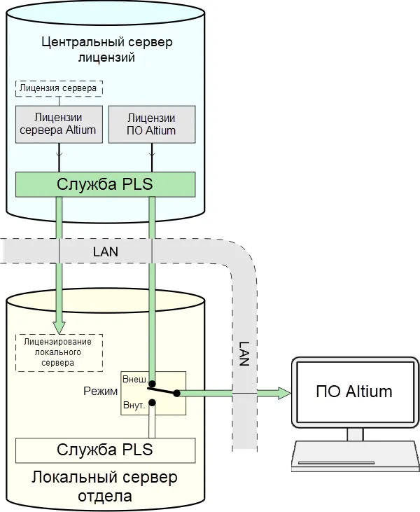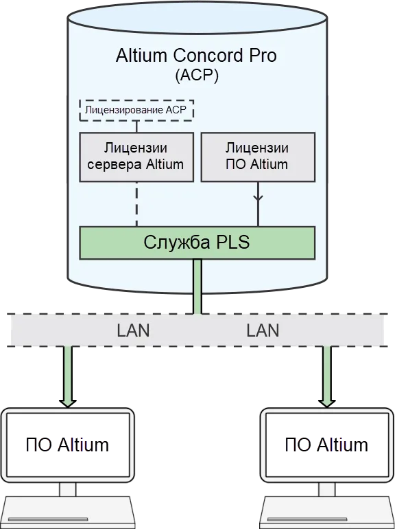 Специальная служба Private License Service (PLS) на ПК, подключенном к локальной сети компании, настраивается администратором для получения лицензий Altium компании и обслуживания ими установок ПО Altium необходимым образом.
