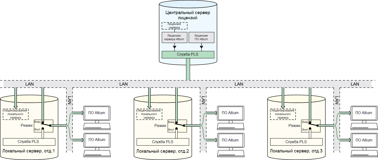 Режим External PLS Altium Concord Pro предназначен для установок, где в сети присутствует множество серверов, и один из них выступает в роли центрального (удаленного) сервера лицензий для всех пользователей. Этот тип установки подходит для больших предприятий, где каждое подразделение (проектирование, разработка и т.д.) может использовать множество установок ПО Altium и локальный сервер подразделения для управлением проектными данными. Серверы проектных данных подразделения и установки ПО Altium лицензируются центральной службой лицензирования, такой как PLS в Altium Concord Pro или сервер Altium Infrastructure Server, выделенного для этой задачи.