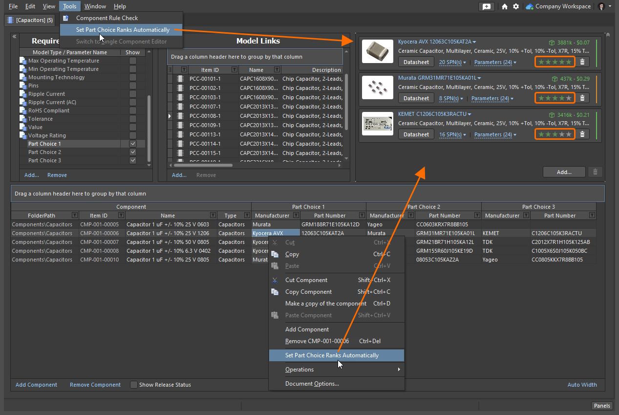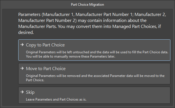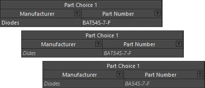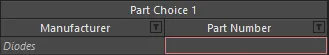 Adding Part Choices – use the Part Choices sub-menu, and choose By MPN. An entry will be added – Part Choice n – to the definitions area, with two columns – Manufacturer and Part Number, with which to specify the choice. Alternatively, if your Workspace supports it and you have configured a custom database part source, choose the By Internal ID menu entry. An entry will be added – Part Choice n – to the definitions area, with two columns – Part source and Internal ID, with which to specify the choice of part from your company's internal parts database. For more information, see Part Choices.