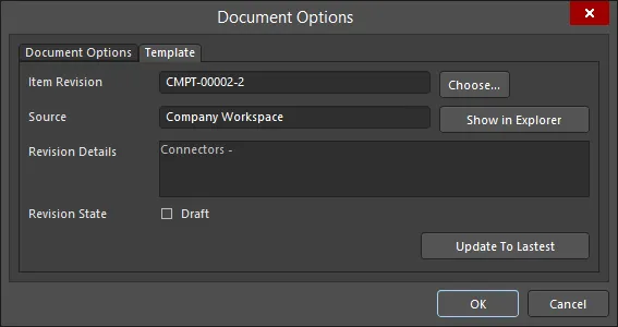 If the components being edited reference a Component Template, the entries specified in the template for Lifecycle Definition, Revision Naming, Component Naming, and Default Folder are used to pre-fill the corresponding fields on the Document Options tab of the Document Options dialog. These options (on the Component editor side) will only be editable provided the corresponding Allow override option is enabled in the template. In addition, the target Workspace will be hard-coded to use the same Workspace as that in which the revision of the Component Template resides.