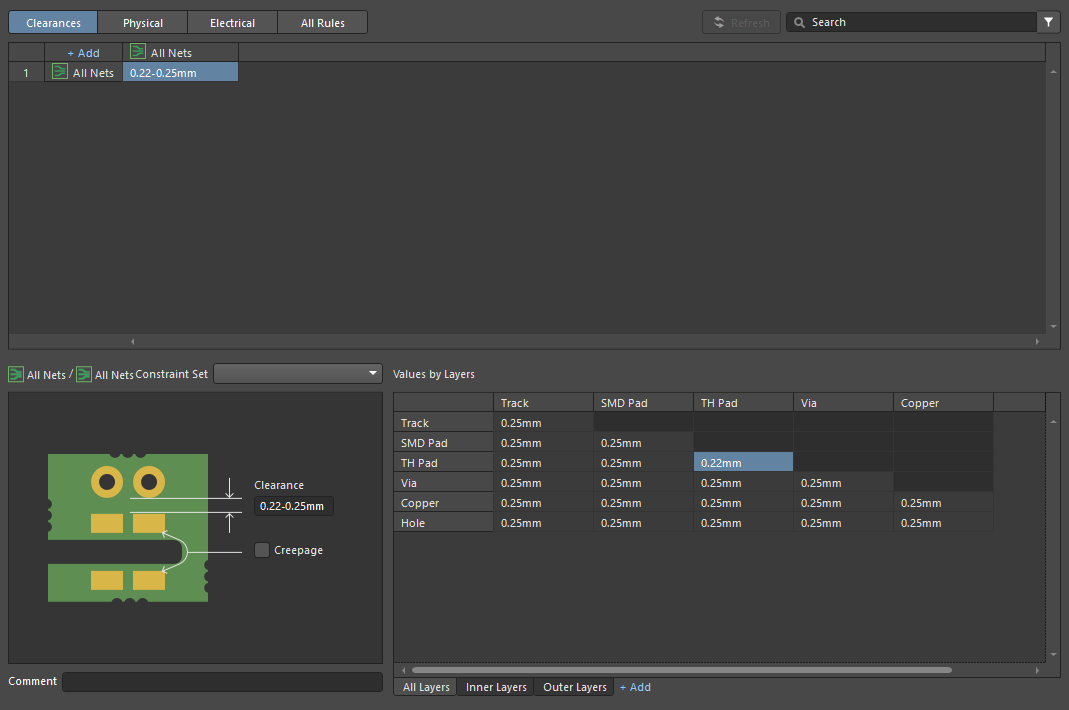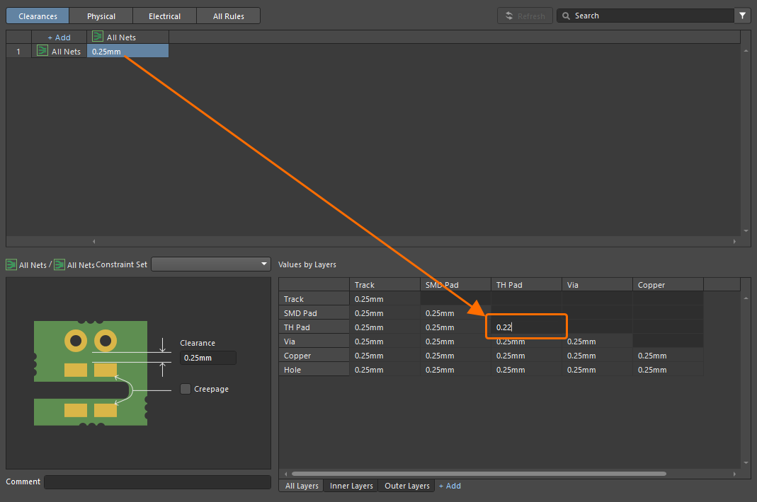 4. Change the TH Pad – to – TH Pad value to 0.22 mm in the grid region at the bottom. To do this, click the cell, type in 0.22, and press Enter.