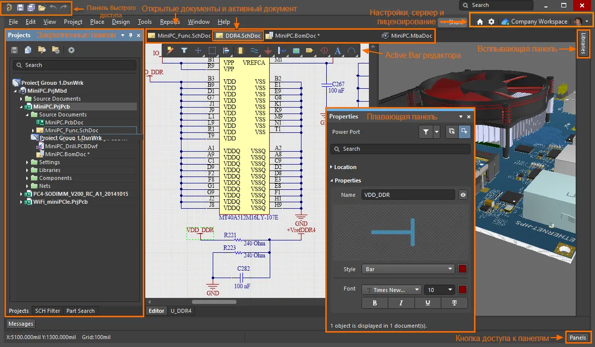 В разделах ниже приведено описание некоторых главных элементов проектного пространства Altium NEXUS, выделенных на изображении выше.