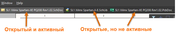 При открытии документа он становится активным документом в главном проектном окне Altium NEXUS. Может быть открыто одновременно множество документов. Для каждого открытого документа отображается вкладка над окном проектирования. Документы могут занимать всё проектное пространство, либо можно разделить проектное пространство для множества документов с помощью команд Split в меню Window. Затем документы можно перетаскивать между разделенными областями.