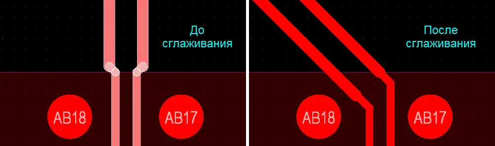 • Трассы под углом, не кратным 45°, не будут сглажены – предполагается, что они размещены таким образом намерено для соответствия требованиям проекта.