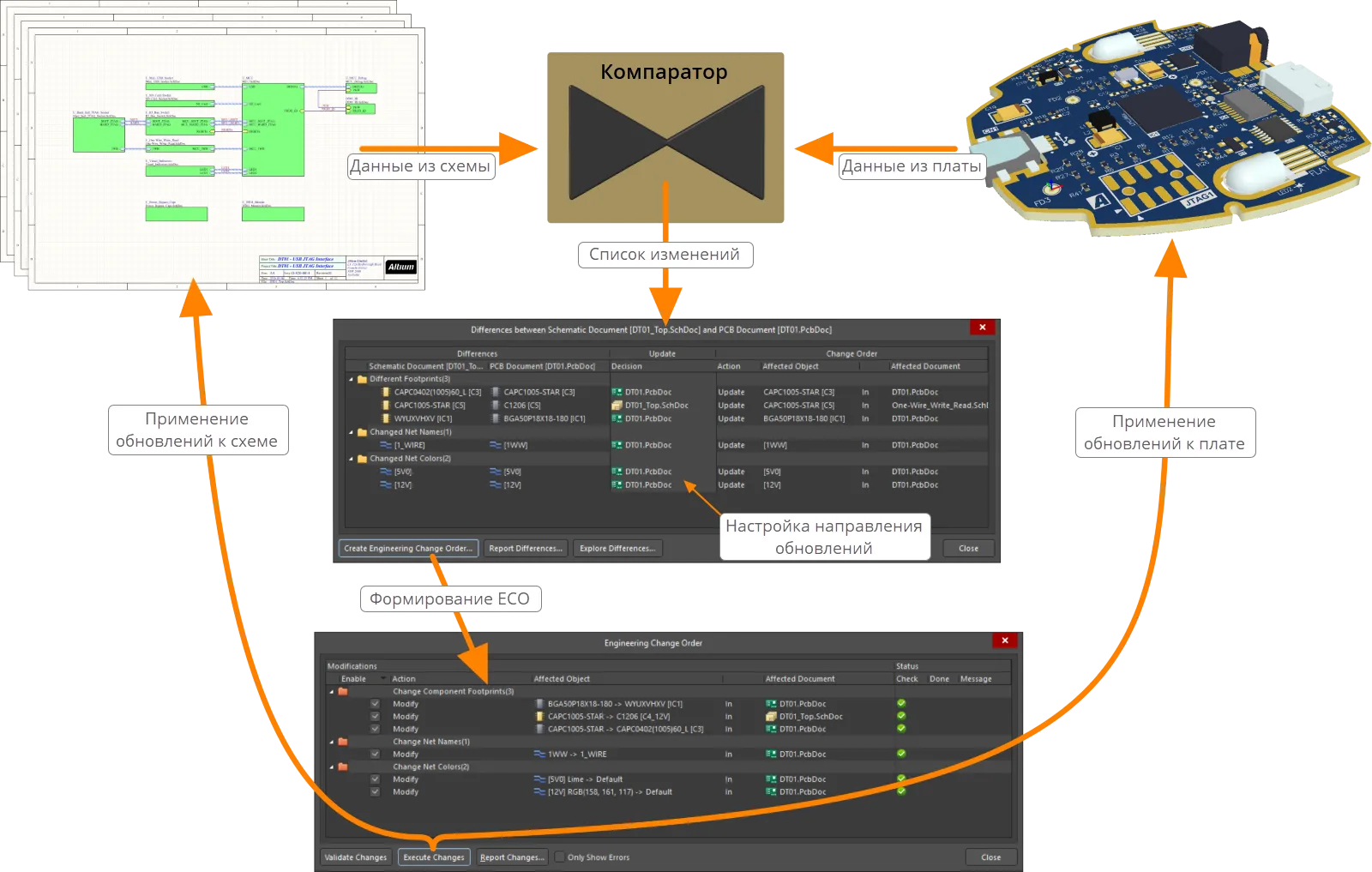 Синхронизация проекта осуществляется непосредственно между редакторами схем и плат. Система использует модуль сравнения (компаратор), чтобы сравнивать все аспекты проекта и выводить список различий. Проектировщик решает, какую сторону следует изменить, чтобы устранить различия, после чего происходит формирование списка запросов на инженерные изменения (Engineering Change Order, ECO). После применения этих запросов, две стороны проекта становятся синхронизированными.