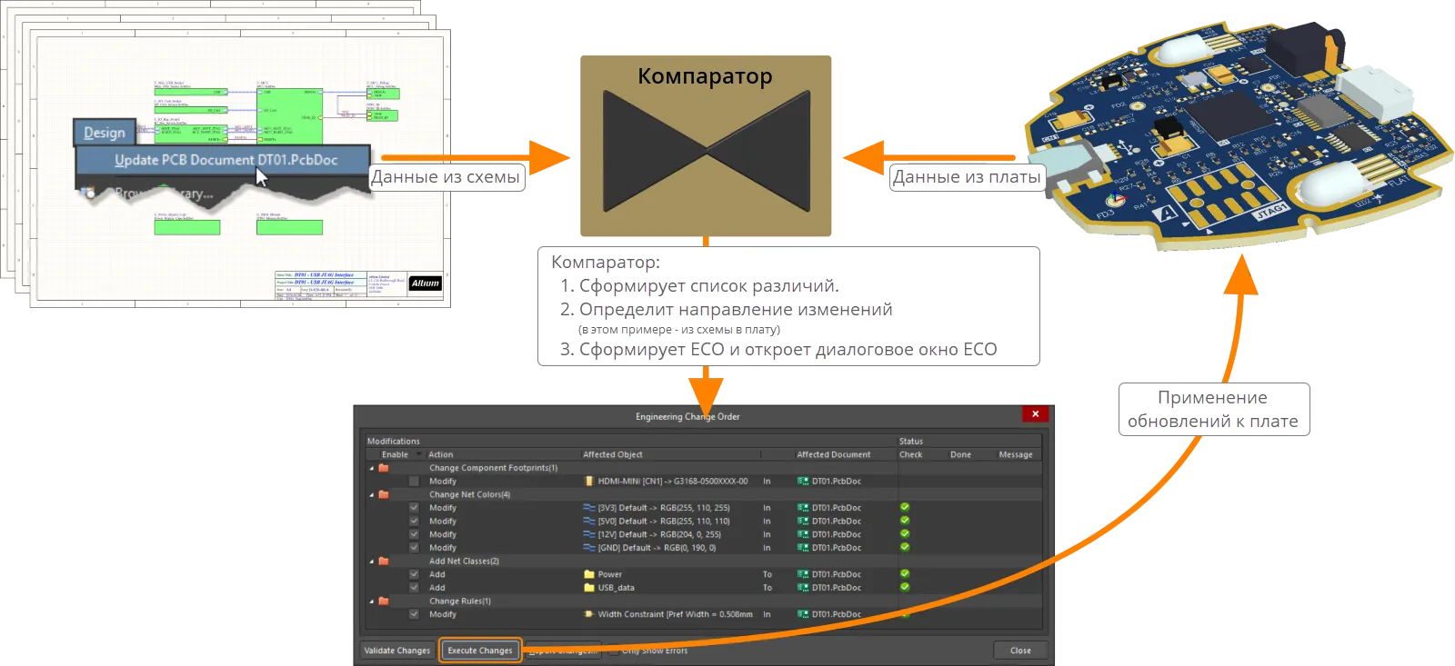 Процесс синхронизации находит и обрабатывает различия схемы и платы.Процесс синхронизации находит и обрабатывает различия схемы и платы.