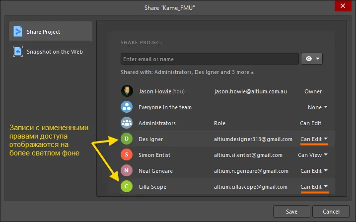 Чтобы опубликовать проект человеку за пределами вашей организации, независимо от того, есть у него учетная запись AltiumLive или нет, вам необходимо ввести его полный email-адрес и нажать Enter.