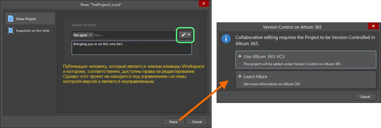 Только член команды Workspace, у которого есть права на редактирования, может опубликовать динамический проект другим людям. У администраторов всегда есть возможность публикации проектов. При публикации пользователю за пределами команды Workspace (для просмотра и комментирования проекта через интерфейс платформы Altium 365) он сможет опубликовать этот проект дальше, из этого интерфейса.