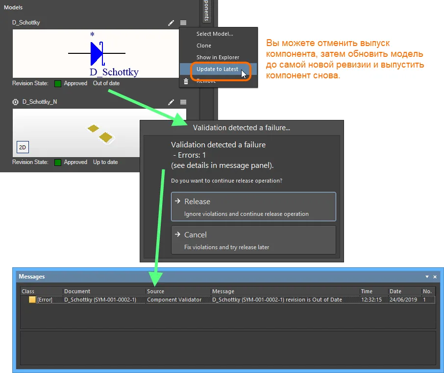 Подобно тому, как для проекта платы существует валидация, позволяющая найти различные нарушения в проекте, в редакторе Component Editor есть средство валидации компонента (Component Validator). Все найденные нарушения будут представлены списком в панели Messages.