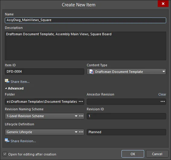 Для многих типов объектов вы можете внести изменения и выпустить соответствующий проектный документ в начальную ревизию объекта после его создания. Для этого включите параметр Open for editing after creation в нижней части диалогового окна Create New Item (этот параметр включен по умолчанию). Будет создан объект и открыт соответствующий временный редактор, где вы можете создать данные для этого объекта. Для получения более подробной информации о работе с объектом определенного типа перейдите на соответствующую страницу, ссылка на которую приведена в таблице выше.