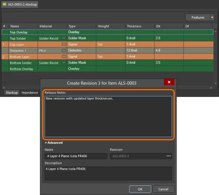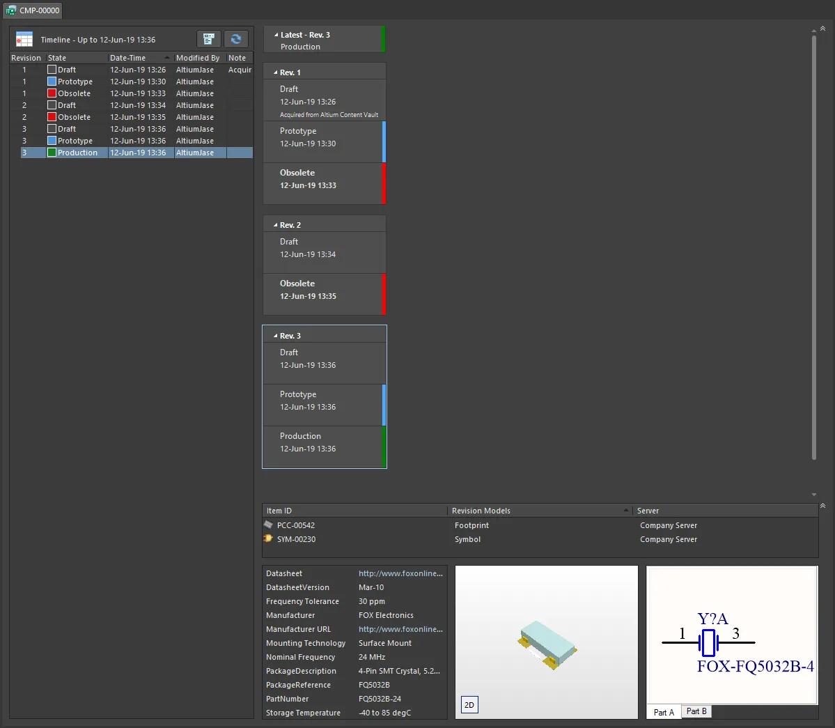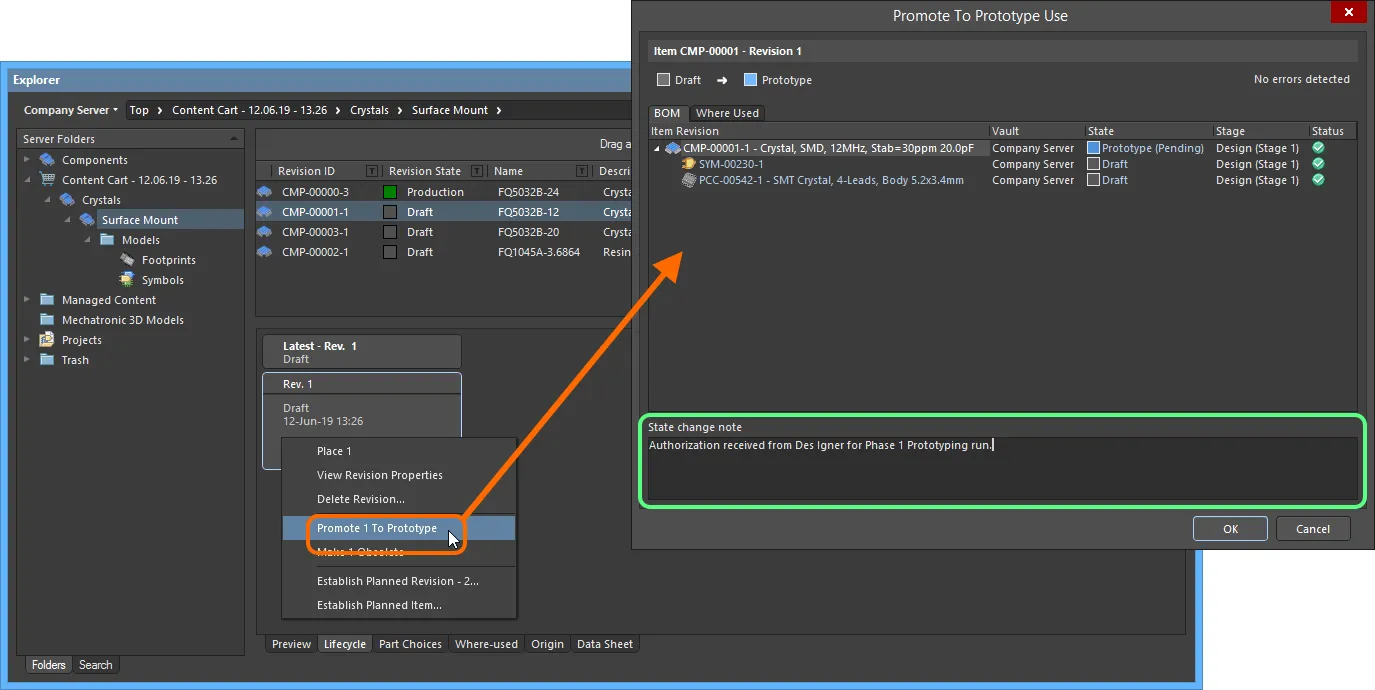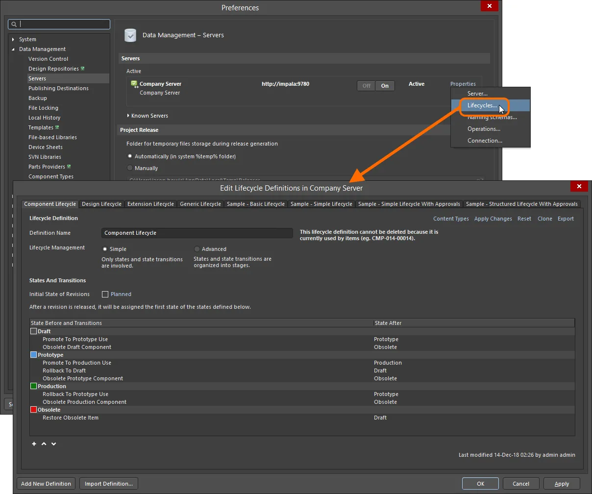 Управление жизненным циклом ревизий объектов осуществляется вручную, в соответствии с принципами и практиками работы, принятыми в компании. Рассмотрим пример ревизии объекта PCB Fabrication Data Item, который содержит в себе данные, необходимые для изготовления печатной платы. После формирования этих данных, жизненный цикл этой ревизии может быть повышен, например, до состояния In Prototype (На стадии прототипирования), и после успешного прототипирования эта ревизия перейдет до состояния In Production (На стадии производства). Позже может понадобиться другая ревизия того же объекта (другая коробка!) с улучшенными характеристиками. После выпуска, эта вторая ревизия пройдет по стадиям от прототипирования до производства, в то время как предыдущая ревизия объекта устареет. Сутью является то, что информация о жизненном цикле показывает, как должно использоваться содержимое "коробки" ревизии объекта.