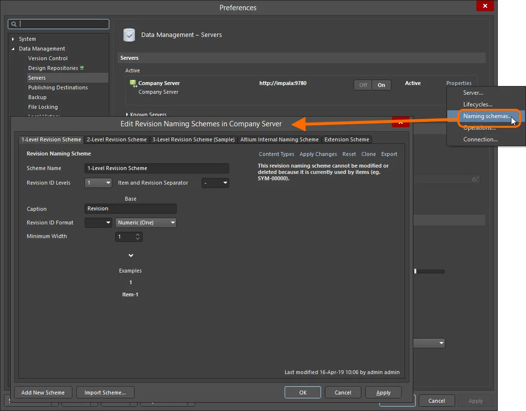 Чтобы обеспечить самый высокий уровень гибкости, на сервере управляемых данных доступен ряд готовых схем именования ревизий, и здесь также поддерживается определение пользовательских схем именования. Схема именования ревизий определяется на уровне сервера и применяется при создании объекта. Чтобы указать схемы именования для активного сервера, в который вы в данный момент вошли, выполните следующее: