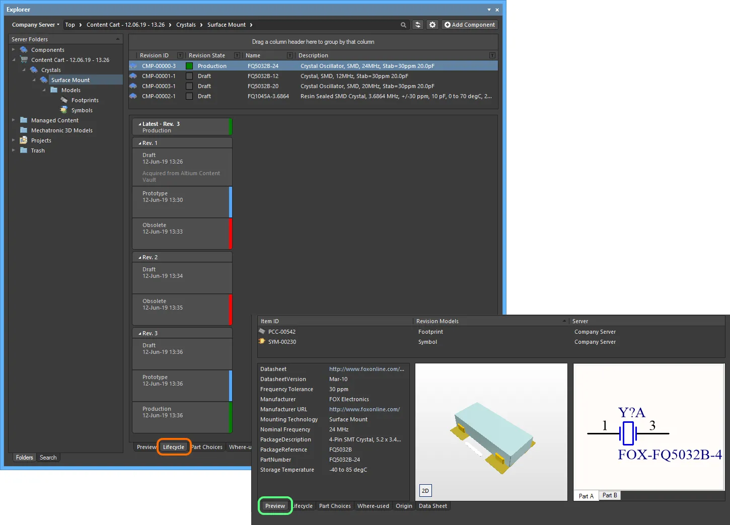 Доступ к информации о ревизиях и жизненном цикле объекта непосредственно через панель Explorer путем выбора ревизии объекта и использования вкладки аспектного вида Lifecycle. Переключитесь на вкладку аспектного вида Preview, чтобы увидеть данные, выпущенные в эту ревизию объекта.