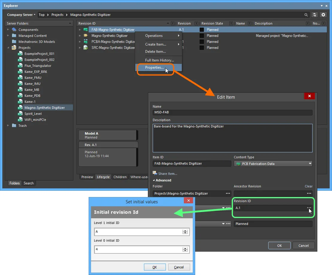 При переходе от концепции неуправляемых проектов к управляемым необходимо мигрировать существующие данные на сервер. Эти данные могли пройти через множество итераций, и их ревизиям могли быть присвоены номера в соответствии с тем, как это принято в организации. Например, ревизия 3 платы Magno-Synthetic Digitizer уже могла уйти в серийное производство, а в ревизию 4 могли быть добавлены улучшения. При выпуске на сервер управляемых данных, выпускать начальную ревизию снова с номера 1 было бы, по крайней мере, неоднозначно, причем не только внутри организации, но и, что более важно, для клиентов (которые ожидают версию, более новую по сравнению с ревизией 3).