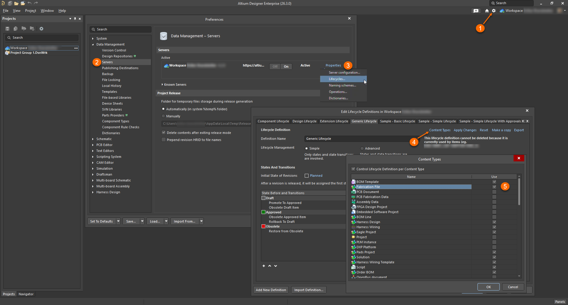 When attempting to upload a Gerber package to a project in an Altium 365 workspace, users may receive the error: “A conflict occurred within the current state of the target resource. Items of the ‘Fabrication File’ Content Type are restricted to view-only because the Content Type is not assigned to a Lifecycle.” The issue is caused by the Fabrication File Content Type not being correctly assigned to the required Lifecycle definition. The Content Type assignment for Fabrication File cannot be verified or adjusted directly in Altium 365 because this Content Type is not visible there; it must be checked and configured from within Altium Designer instead.